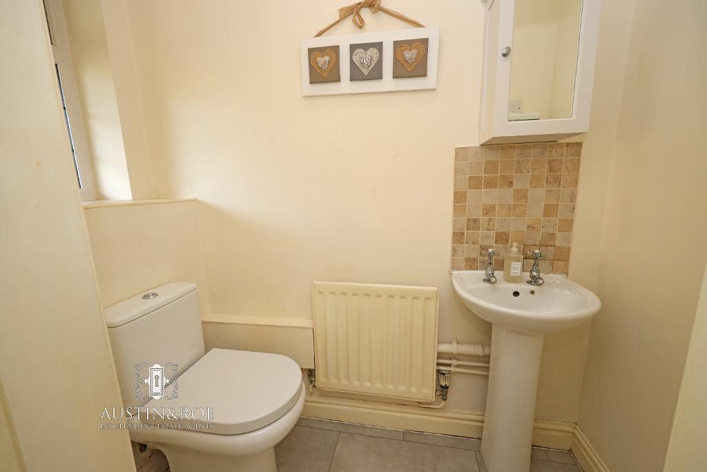 5' 7'' x 2' 10'' (1.71m x 0.87m) The Guest Cloakroom has neutral décor, a white ceiling with central light fitting, an obscured glass double glazed window to the front aspect, a wall mounted central heating radiator and pale grey stone effect ceramic floor tiling. The white sanitaryware consists of a pedestal wash hand basin with chrome taps, and a close coupled WC with push button flush.