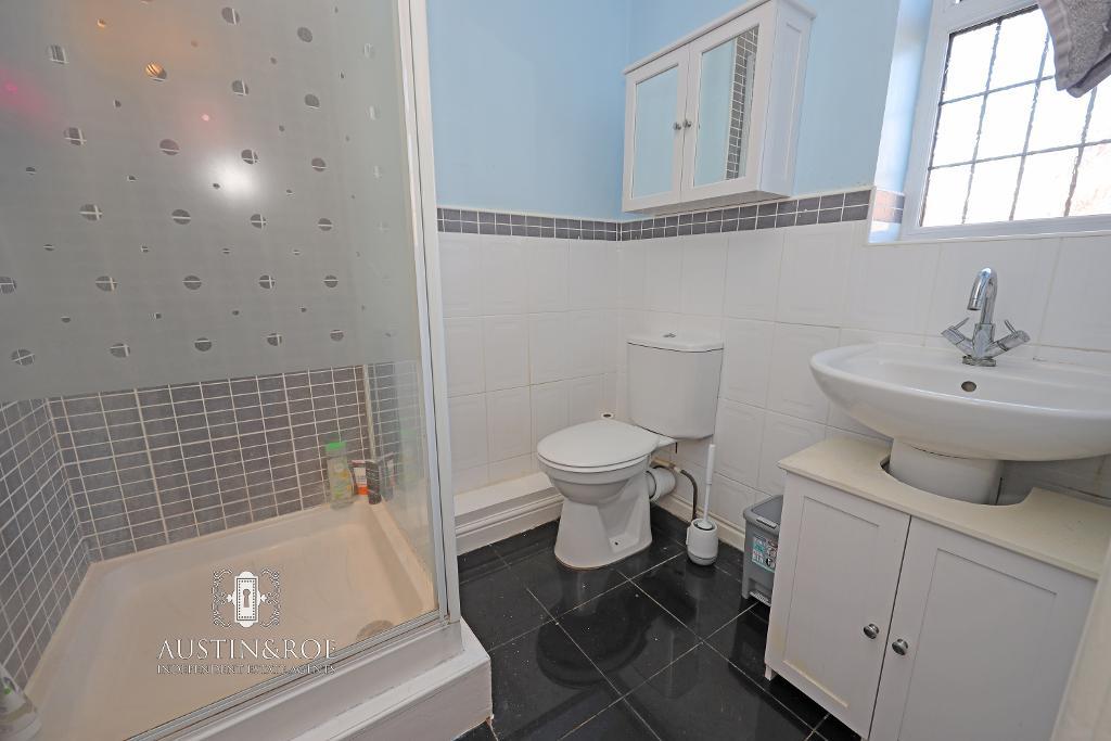 5' 1'' x 6' 1'' (1.55m x 1.87m) The Master Bedroom En-Suite shower room has pale blue décor with half height white ceramic wall tiling with grey mosaic trim, full height mosaic tiling to the showering area, an obscured glass double glazed window to the front aspect, a wall mounted central heating radiator and black quartz effect floor tiling. The white sanitaryware consist of a pedestal wash hand basin with chrome mixer tap and vanity unit below, a glass showering cubicle with chrome shower, and a close coupled WC with push button flush.