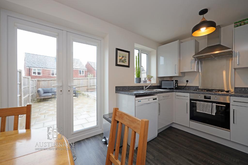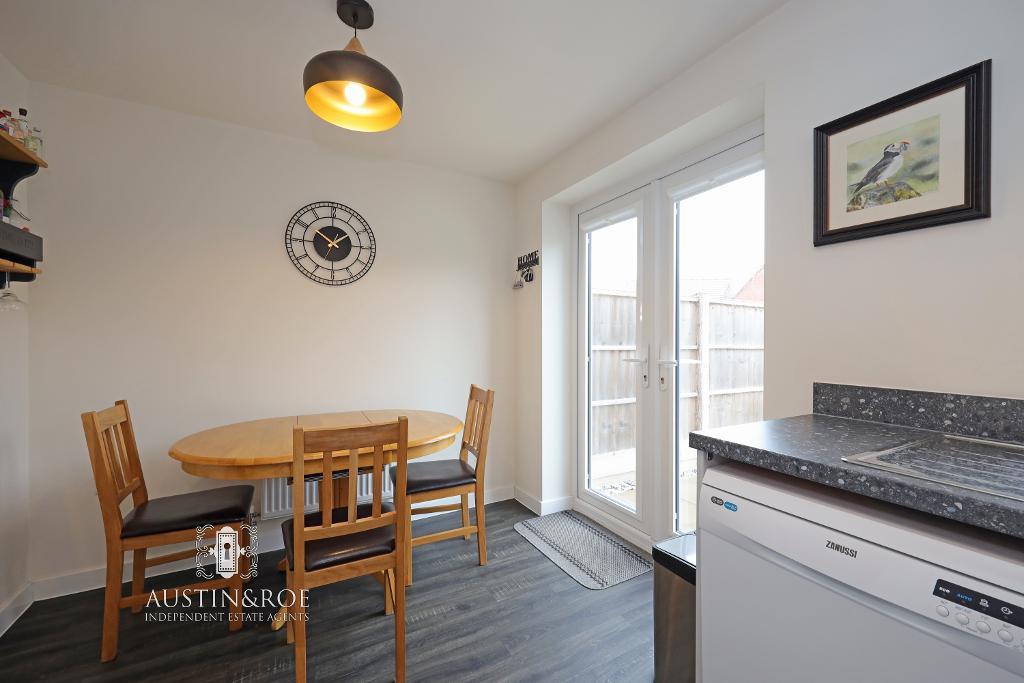 The modern Kitchen Diner has neutral décor, a white ceiling with two pendant light fittings, double glazed patio doors and window to the rear aspect and wood effect vinyl flooring.