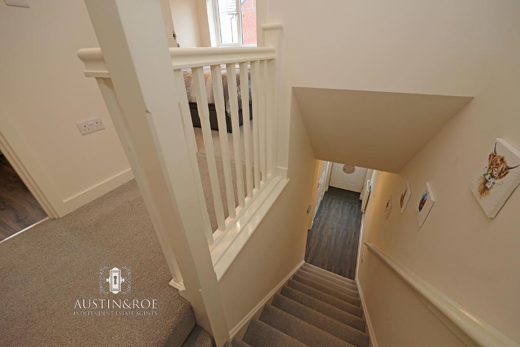 The stairs rise from the Entrance Hallway to the Landing with a quarter turn, with white handrail and balustrade, and pale grey fitted carpet.