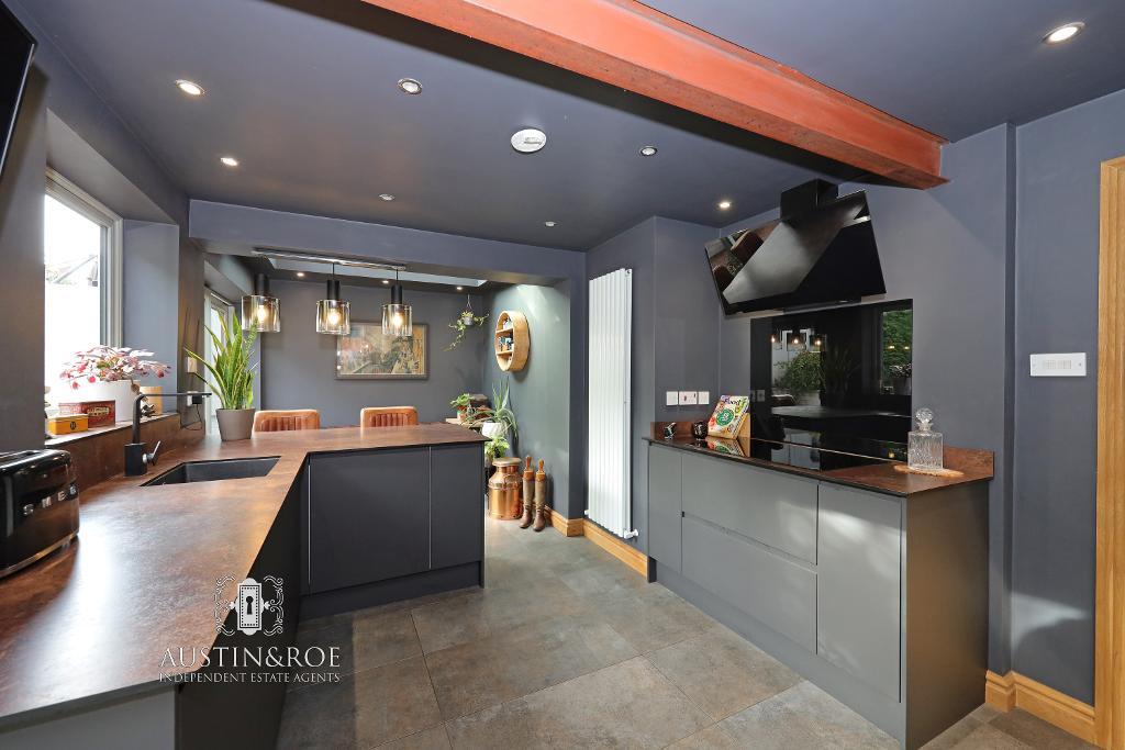 10' 5'' x 15' 10'' (3.19m x 4.83m) The stylish Kitchen has dark grey décor, a dark grey ceiling with recessed spot lights, glass pendant lights over the seating area and exposed steel RSJ beam, double glazed patio doors and window to the rear aspect, a white vertical wall mounted central heating radiator and contemporary concrete effect ceramic tiled flooring. There are a range of dark grey base and larder units, with a metal effect countertop and upstand, inset with a grey undercounter sink and black mixer tap, a glass induction hob with black glass splashback and modern extractor hood above, double integrated electric oven, dishwasher and fridge freezer.