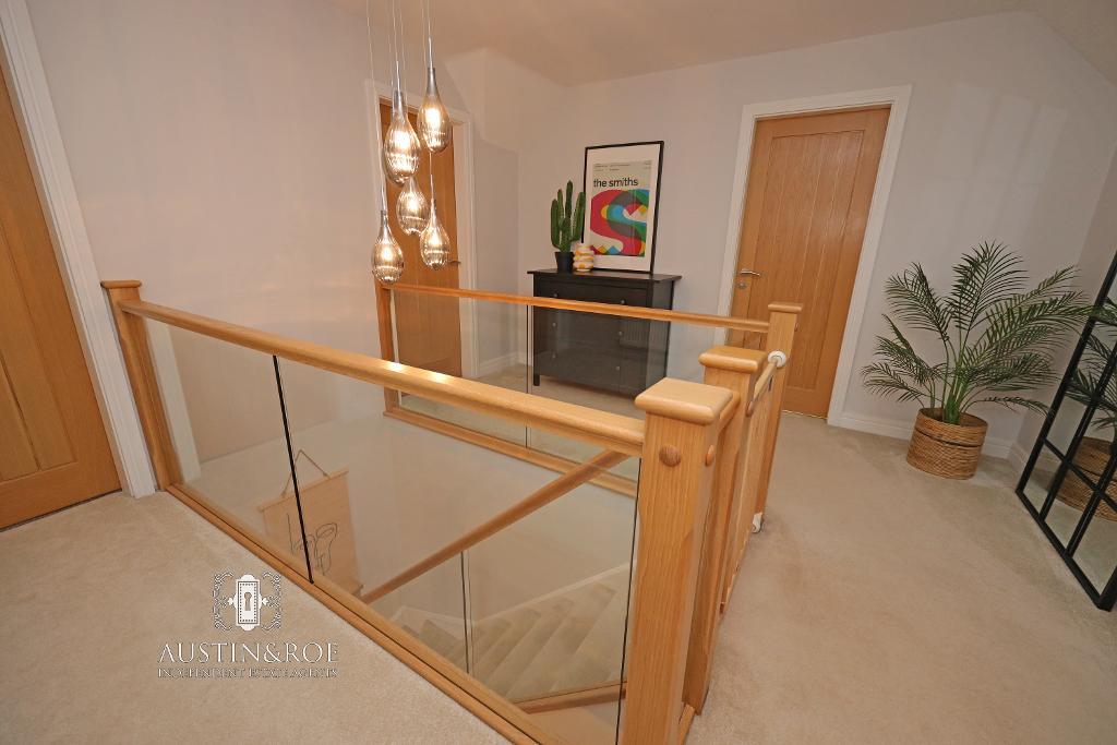 The Stairs rise from the Entrance Hall to the galleried Landing above with glass balustrade and solid oak handrails and newel posts, grey décor, a white ceiling with central drop pendant light fitting, wall mounted central heating radiator and neutral fitted carpet.