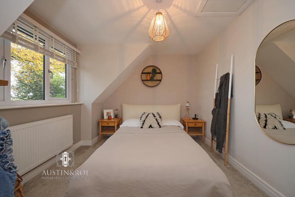 13' 1'' x 10' 2'' (3.99m x 3.11m) The Second Bedroom has cream décor, white vaulted ceiling with central pendant light fitting and loft hatch for access to the roof space above, a double glazed window to the front aspect with a wall mounted central heating radiator below, grey fitted carpet, TV connection and power points.