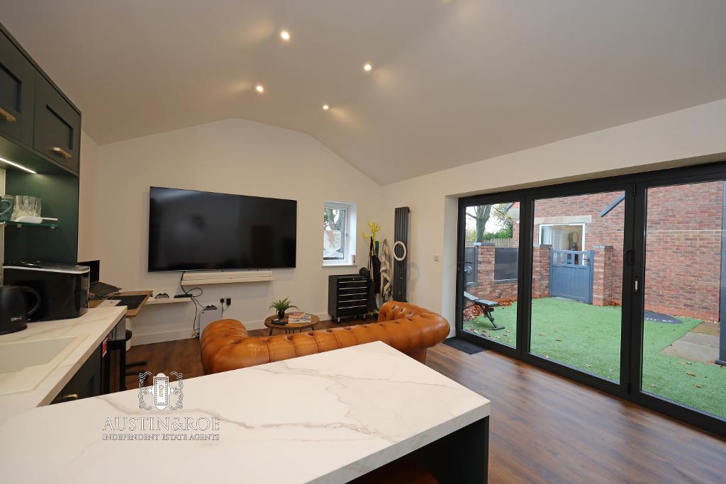 20' 8'' x 13' 4'' (6.3m x 4.07m) The self contained brick built Annexe has white décor, a white vaulted ceiling with recessed spot lights, a double glazed bi-fold door, an electric wall mounted central heating radiator and wood effect vinyl flooring. There is a fitted Kitchen area with dark grey base and wall units, a marble effect countertop extending to form a breakfast bar inset with a white composite sink with gold mixer tap, an integrated glass door fridge and integrated lighting / power. The Shower Room has white décor, a white ceiling with recessed spot light fittings, an obscured glass double glazed window to the side aspect and wood effect vinyl flooring. The sanitaryware consists of a compact vanity unit with countertop wash hand basin and chrome mixer tap, a glass showering enclosure with marble effect wall panelling and white electric shower, and a close coupled WC with push button flush.