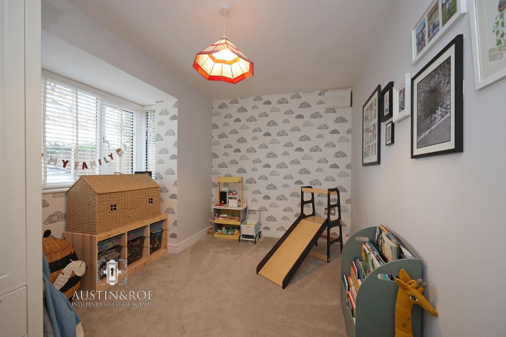 13' 2'' x 9' 9'' (4.02m x 2.99m) The Office / Play Room has grey décor with a graphic 'cloud' wallcovering to one wall, a white ceiling with central pendant light fitting, a double glazed bay window to the front aspect and neutral fitted carpet.