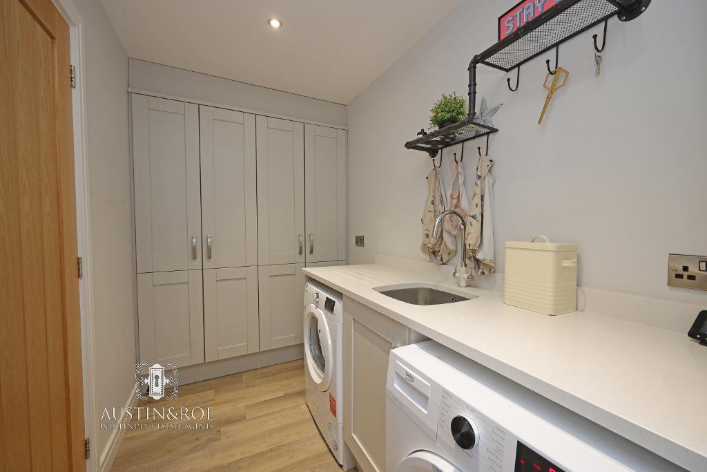 13' 2'' x 5' 4'' (4.02m x 1.64m) The Utility Room has pale grey walls, a white ceiling with recessed LED spotlights and an extractor fan and "Karndean" wood effect flooring continues from the dining area. There is a selection of grey shaker style full height, base and wall units with a white granite countertop inset with a stainless steel sink, grooved granite drainer and chrome swan-neck duel lever mixer tap, there is space for a washing machine and tumble dryer and a double glazed external door to the side aspect.