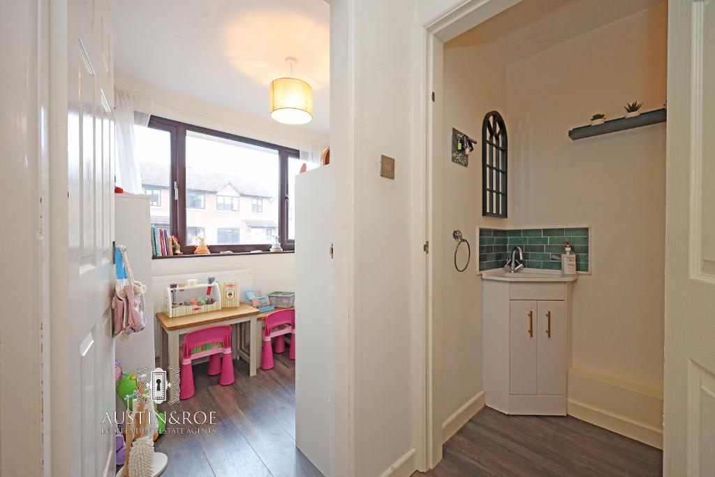6' 2'' x 7' 6'' (1.9m x 2.3m) The Office / Play Room has neutral décor, a white ceiling with central pendant light fitting, a double glazed window to the front aspect with a wall mounted central heating radiator below, and wood effect vinyl flooring.