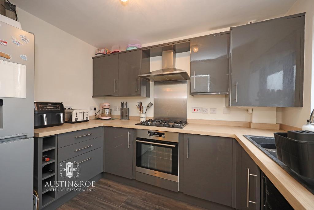 9' 6'' x 6' 6'' (2.9m x 2m) The modern Kitchen has neutral décor, a white ceiling with central light fitting, a double glazed window to the front aspect with fitted roller blind and wood effect vinyl flooring. There are a range of grey high gloss wall and base units, with a pale wood effect countertop inset with a modern grey bowl and half sink with chrome swan neck mixer tap, a gas hob with integrated electric oven below and extractor hood above, and spaces for a fridge freezer and dishwasher.