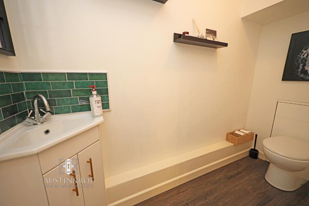 7' 10'' x 2' 11'' (2.4m x 0.9m) The Guest Cloakroom has neutral décor, a white ceiling with central light fitting and wood effect vinyl flooring. The sanitaryware consists of a white vanity unit with inset wash hand basin with chrome mixer tap and tiled splashback, and a concealed cistern WC with push button flush.