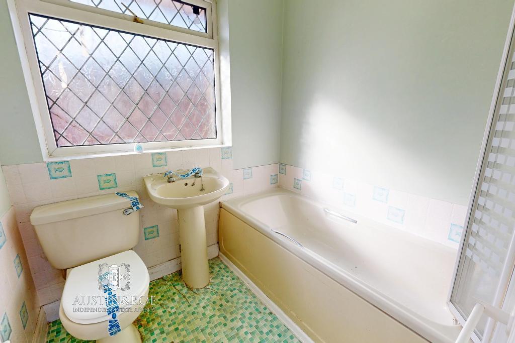 6' 4'' x 5' 7'' (1.95m x 1.72m) The Family Bathroom has pale green décor with half height ceramic wall tiling, a white ceiling with central light fitting, an obscured glass double glazed window to the side aspect, a wall mounted central heating radiator and mosaic effect vinyl flooring. The cream sanitaryware consists of a panel bath with chrome mixer taps and shower attachment above, a pedestal wash hand basin with chrome taps and a close coupled WC with lever flush.