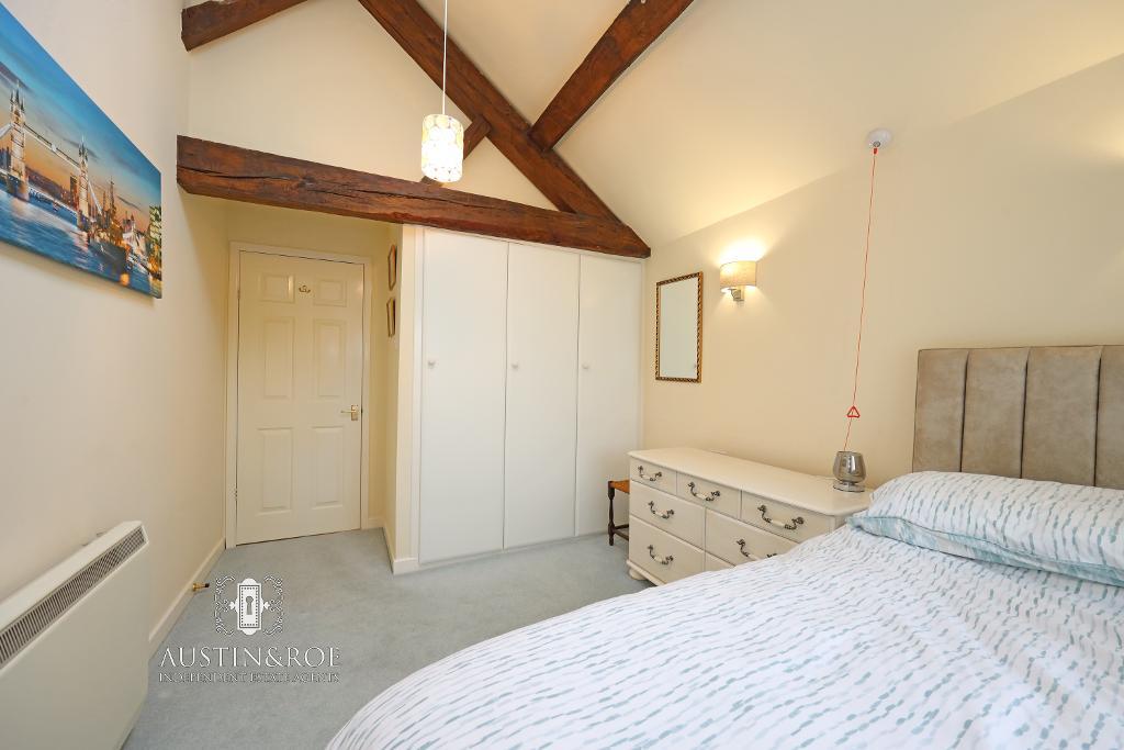 13' 11'' x 8' 11'' (4.26m x 2.73m) The light and airy main Bedroom has neutral décor with two wall lights, a white vaulted ceiling with exposed wooden structural beams, an opening Velux roof window and pendant light fitting, a double glazed window to the front aspect, a wall mounted electric central heating radiator, fitted wardrobes and grey fitted carpet.