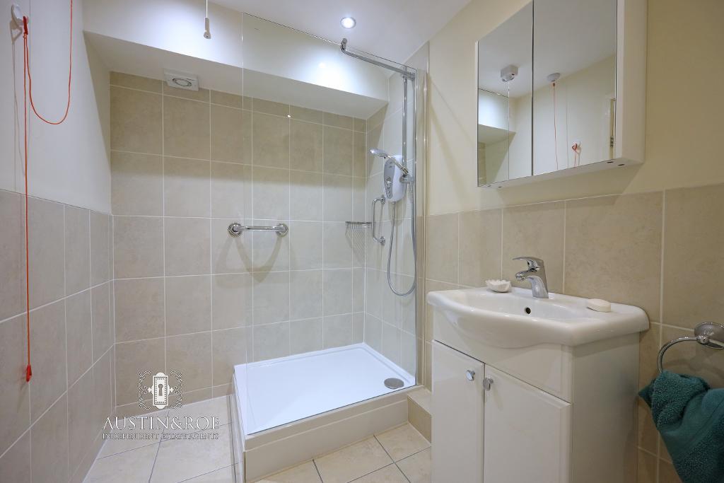 9' 4'' x 5' 3'' (2.87m x 1.61m) The modern Shower room benefits from half height stone effect ceramic wall tiling, full height in the showering area, a white ceiling with recessed spot lights, an electric wall mounted heated towel rail and stone effect ceramic floor tiles. The sanitaryware consists of a vanity unit with white wash hand basin and chrome mixer tap, a showering enclosure with glass screen, electric shower and chrome fittings and a close coupled WC with push button flush.
