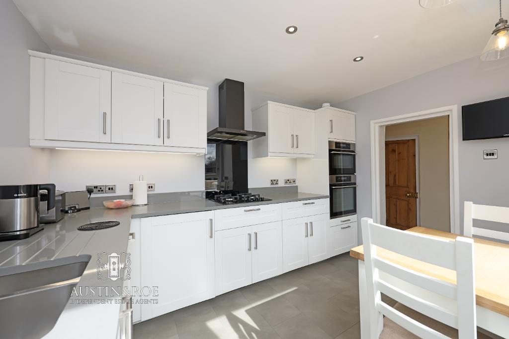 11' 6'' x 10' 1'' (3.52m x 3.09m) The modern Kitchen has pale grey décor, a white ceiling with three pendant lights and three recessed spot light, two large double glazed windows to the rear aspect, a wall mounted central heating radiator and grey stone effect vinyl flooring. There are a range of white wall and base units, with a pale grey quartz countertop and upstand, inset with an under counter bowl and a half sink and stainless steel swan neck mixer tap, a gas hob with glass splashback and extractor hood above, an integrated electric double oven/microwave/grill, integrated fridge freezer and dishwasher.