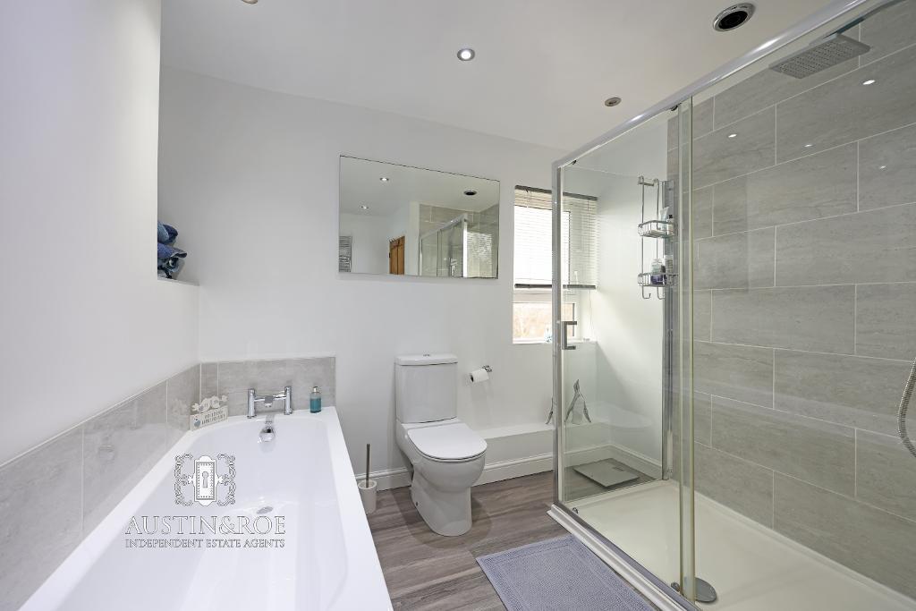 8' 8'' x 10' 2'' (2.66m x 3.11m) The modern Family Bathroom has white decor, grey marble effect ceramic wall tiling to the bathing areas and shower, a white ceiling with recessed spot lights, a double glazed window to the rear aspect, a chrome heated towel rail and bleached wood effect vinyl flooring. The sanitaryware consists of a panel bath with chrome taps, a large shower enclosure with glass screen, chrome fittings and a large rainfall shower head, a white vanity unit with inset wash hand basin and chrome mixer tap, and a close coupled WC with push button flush.