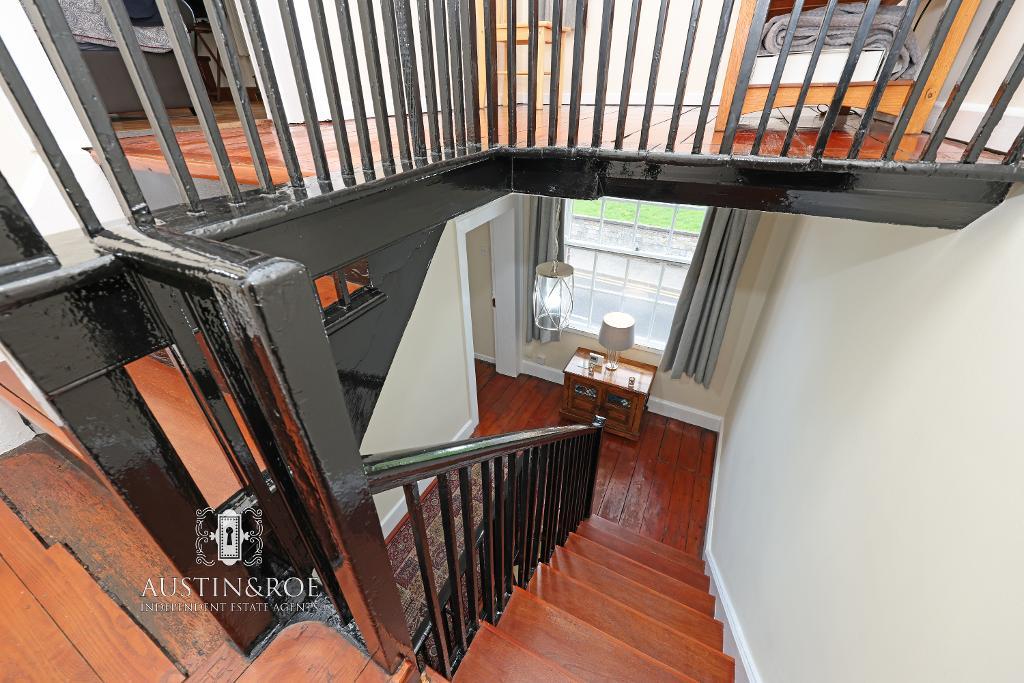6' 11'' x 9' 6'' (2.12m x 2.9m) The Georgian staircase rises from the Entrance Hall to the landing above with a half turn, it has grey and white décor, a mid height ornate plaster dado rail, painted black handrail and balustrade and wooden stair treads. The Landing has neutral décor, a white ceiling with pendant light fitting, an original sash window to the front aspect with secondary glazing, and original wooden flooring. Doors open in to the two Bedrooms and Family Bathroom, and a further staircase rises to the Second Floor.
