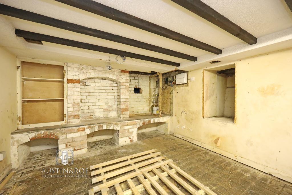 12' 9'' x 10' 9'' (3.9m x 3.3m) The Cellar has neutrally painted plastered walls, with one exposed brickwork wall with feature arches, a neutral ceiling with black beams and two light fittings, there are power points and engineered blue brick flooring.