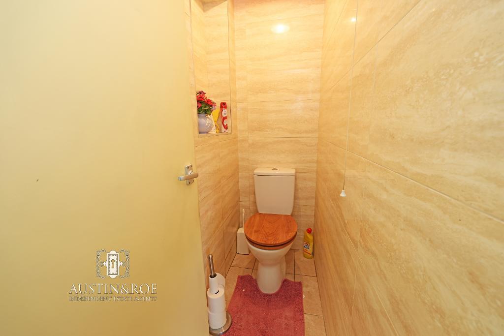 5' 5'' x 2' 1'' (1.66m x 0.64m) The WC follows in style to the Family Bathroom, with full height stone effect ceramic wall and floor tiling, a wooden panelled ceiling with central light fitting, and a close coupled WC with push button flush.