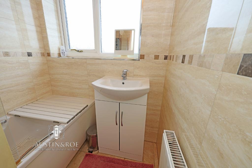 5' 0'' x 5' 5'' (1.54m x 1.66m) The Bathroom benefits from full height stone effect ceramic wall tiling with feature border, a wood panelled ceiling with central light fitting, an obscured glass double glazed window to the rear aspect, a wall mounted central heating radiator and stone effect ceramic tiled floor. The sanitaryware consists of a white panel bath with chrome electric shower and glass screen and a white vanity unit with inset wash hand basin and chrome mixer tap.