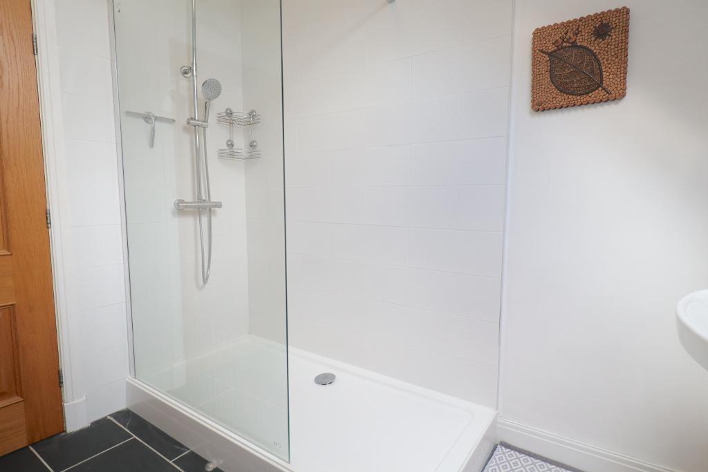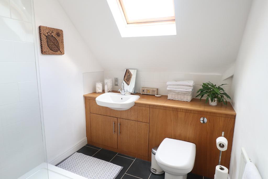 9' 11'' x 6' 11'' (3.04m x 2.13m) The stylish Shower Room has white decor, a white vaulted ceiling with central light fitting, a double glazed "Velux" roof window, wall mounted central heating radiator and black porcelain floor tiles. The white sanitary ware comprises a double shower tray with glass screen, chrome raindrop shower and standard shower head, a wooden vanity unit inset with a wash hand basin with swan neck mixer tap and hidden cistern low level WC.