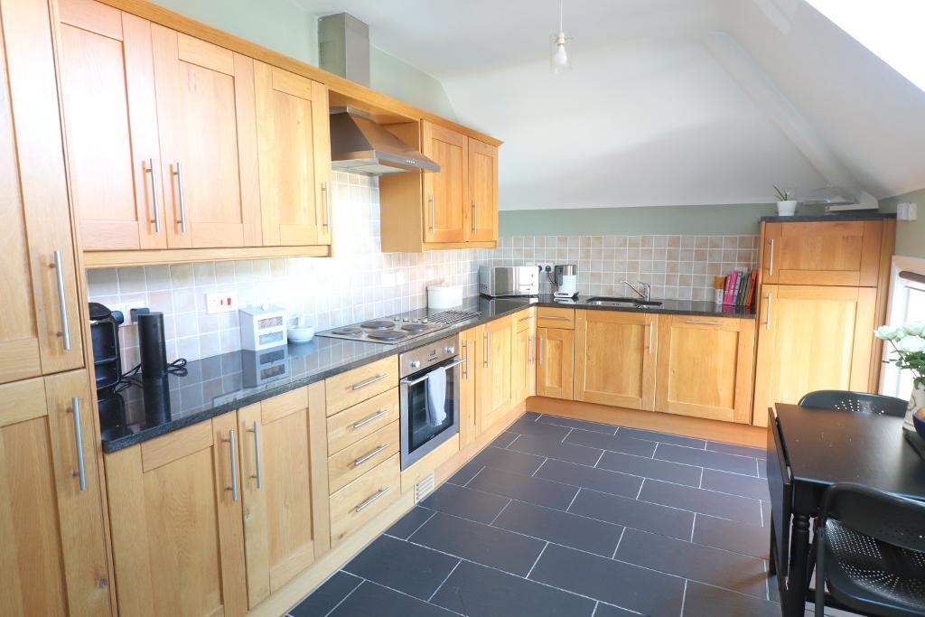 14' 10'' x 9' 4'' (4.53m x 2.85m) The modern Kitchen has grey decor with ceramic tiled splash backs , white vaulted ceiling with twin pendant light fittings, a double glazed "Velux" roof window, a second window, a wall mounted central heating radiator and black porcelain floor tiles. There is a selection of wooden full height, wall and base units with black granite countertops inset with stainless steel one-and-a-half bowl sink, drainer and chrome single lever mixer tap, a stainless steel electric hob with electric oven below and an extractor hood above, the integrated appliances include a dish washer, washing machine and fridge/freezer. There is also ample space for a table and chairs.