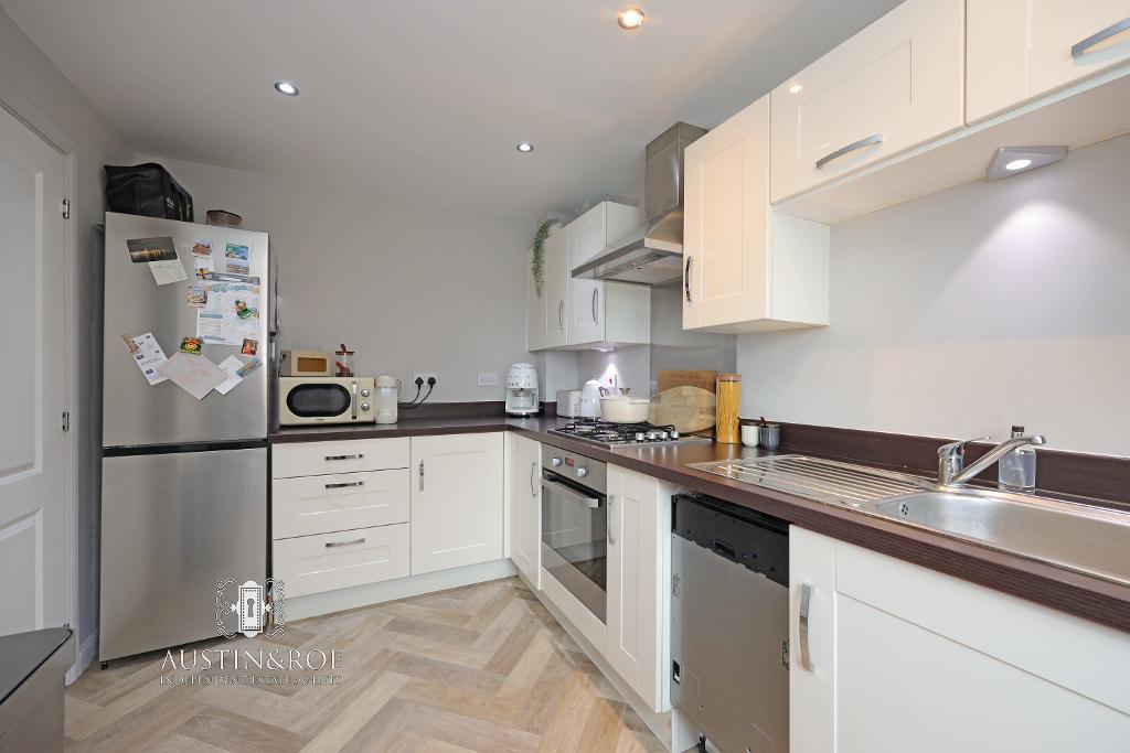 The Kitchen has pale grey décor, a white ceiling with recessed spot lights, a double glazed window to the front aspect with fitted blind, a wall mounted central heating radiator and wood effect vinyl flooring laid in a herringbone pattern.