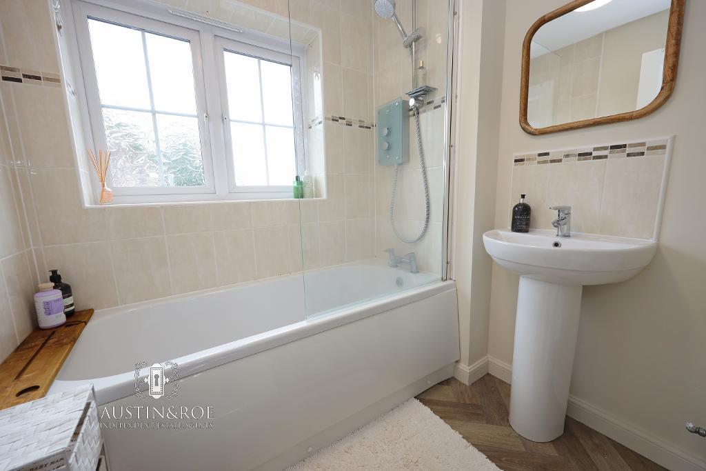 7' 6'' x 6' 2'' (2.29m x 1.9m) The Family Bathroom benefits from full height ceramic wall tiling to the bathing area, neutral décor elsewhere, with a white ceiling, a central light fitting, a double glazed window with obscured glass to the front aspect, a wall mounted central heating radiator and wood effect vinyl flooring laid in a herringbone pattern. The white sanitaryware consists of a panel bath with glass shower screen, chrome taps and an electric shower over, a pedestal wash hand basin with chrome mixer tap, and a close coupled WC with push button flush.