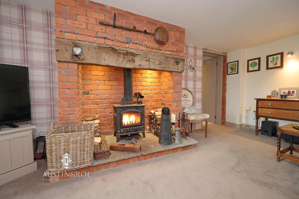 16' 3'' x 18' 3'' (4.97m x 5.57m) The cosy Living Room has neutral décor with a neutral coloured tartan feature wall, a white ceiling with one recessed spot light, wall mounted spot lighting, a double glazed window to the front aspect, a large brick built inglenook fireplace with wood burning stove / back lighting and neutral fitted carpet.