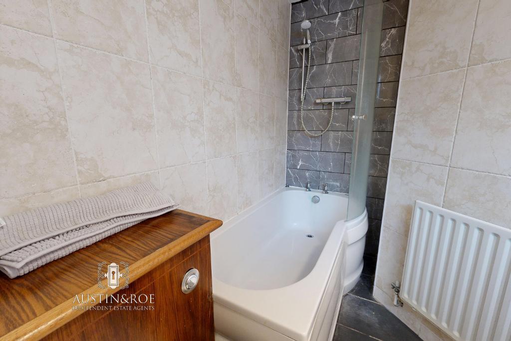 8' 2'' x 11' 6'' (2.49m x 3.51m) The spacious Bathroom benefits from full height ceramic wall tiling, a white ceiling with central light fitting, a high level double glazed window to the rear aspect, a wall mounted central heating radiator and slate effect ceramic tiled flooring. The sanitaryware consists of a panel shower bath with curved glass screen and chrome fittings, a pedestal wash hand basin with chrome mixer tap, and a concealed cistern WC with push button flush.