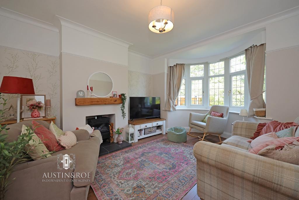 15' 6'' x 11' 11'' (4.73m x 3.64m) The Living Room has neutral décor with feature neutral toned botanical print wallcovering to the chimney breast alcoves, a white ceiling with central pendant light and coved cornicing, a large double glazed curved bay window to the front aspect, an inset fireplace with an oak beam mantle, a wall mounted central heating radiator and wooden flooring.
