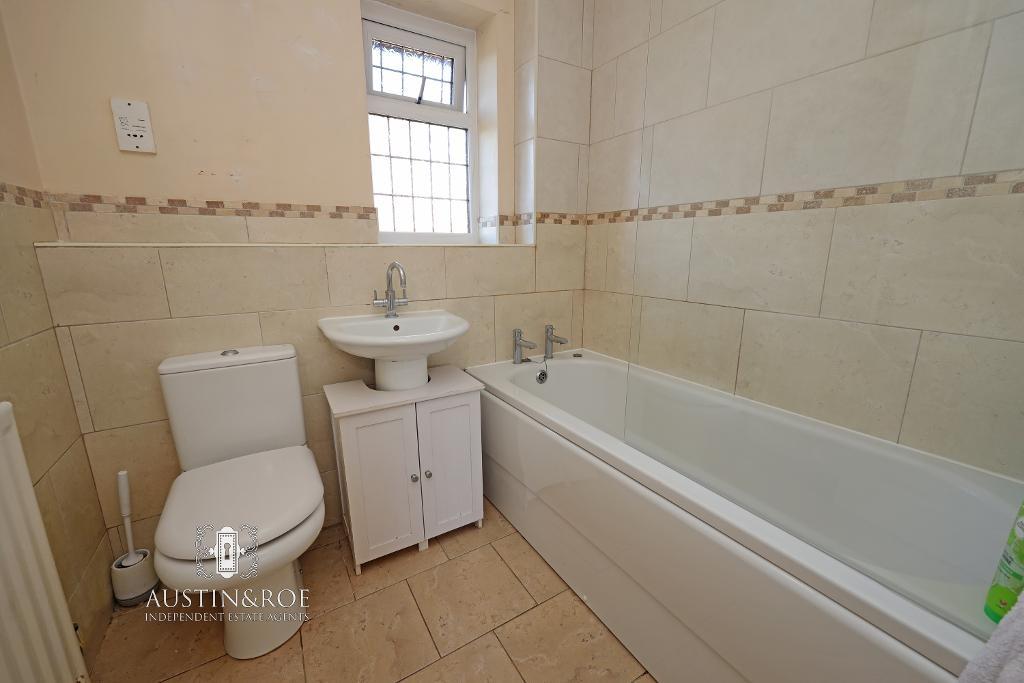 6' 2'' x 6' 1'' (1.88m x 1.87m) The Family Bathroom has neutral décor, with sandstone effect wall tiling with mosaic trim, an obscured glass double glazed window to the front aspect, a wall mounted central heating radiator and sandstone effect ceramic floor tiles. The white sanitaryware consist of a panel bath with chrome taps, a glass shower screen with chrome shower, a pedestal wash hand basin with chrome mixer tap, and a close coupled WC with push button flush.