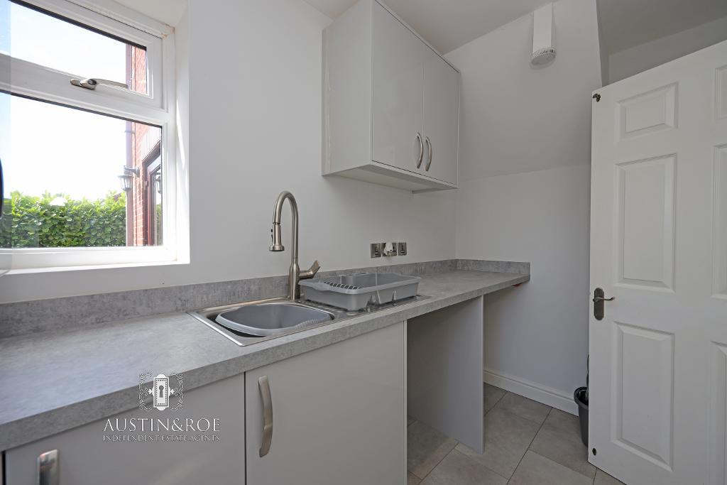 9' 5'' x 5' 9'' (2.88m x 1.77m) The Utility continues in style from the Kitchen, with a double glazed window to the side aspect, a double glazed door leading in to the Garden, a range of pale grey high gloss wall and base units with granite effect countertop, inset with a stainless steel sink and mixer tap, with spaces below for a washing machine and tumble dryer.