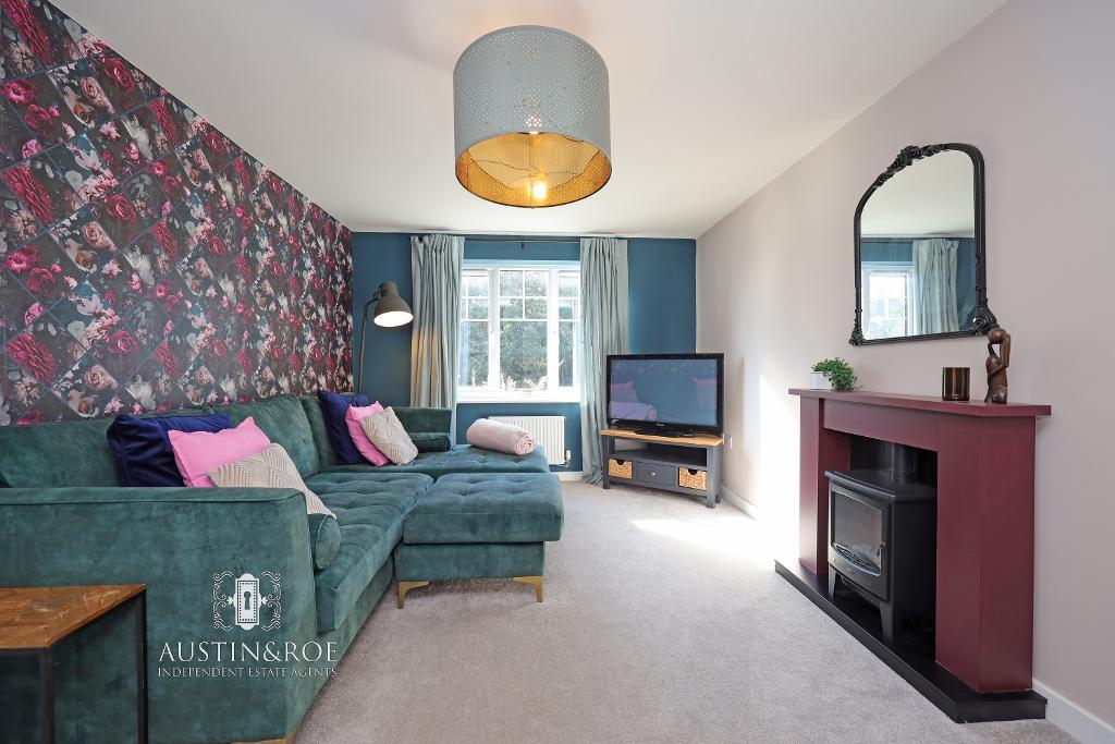 16' 0'' x 10' 6'' (4.9m x 3.22m) The Living Room has teal blue and grey décor with a floral feature wall, a white ceiling with central pendant light fitting, a double glazed window to the front aspect, a wood burning stove with contemporary plum coloured surround and granite hearth, a wall mounted central heating radiator and pale grey fitted carpet.