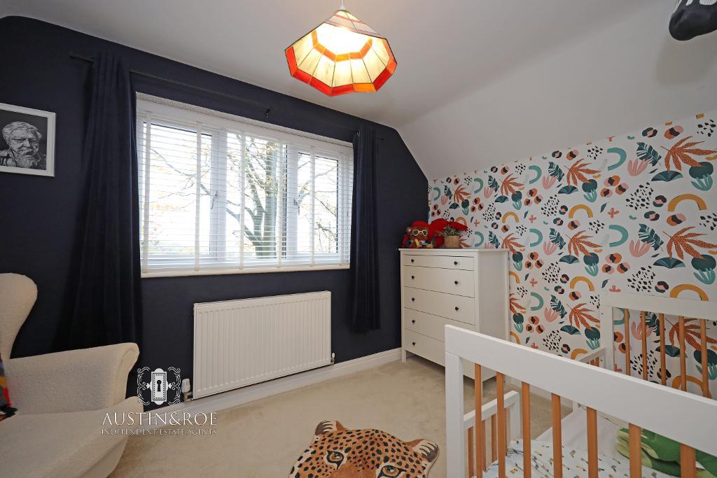 13' 2'' x 9' 9'' (4.02m x 2.99m) The Office / Play Room has grey décor with a graphic 'cloud' wallcovering to one wall, a white ceiling with central pendant light fitting, a double glazed bay window to the front aspect and neutral fitted carpet.