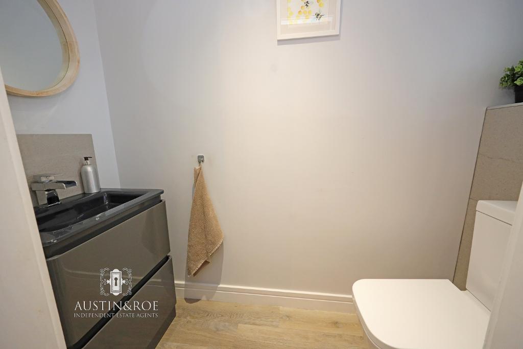 The Guest Cloakroom is conveniently situated just off the Entrance Hall, it has grey décor with tiling behind the sanitary ware, a white ceiling with LED spotlight and extractor fan, double glazed window with obscured glass and "Karndean" wood effect flooring.