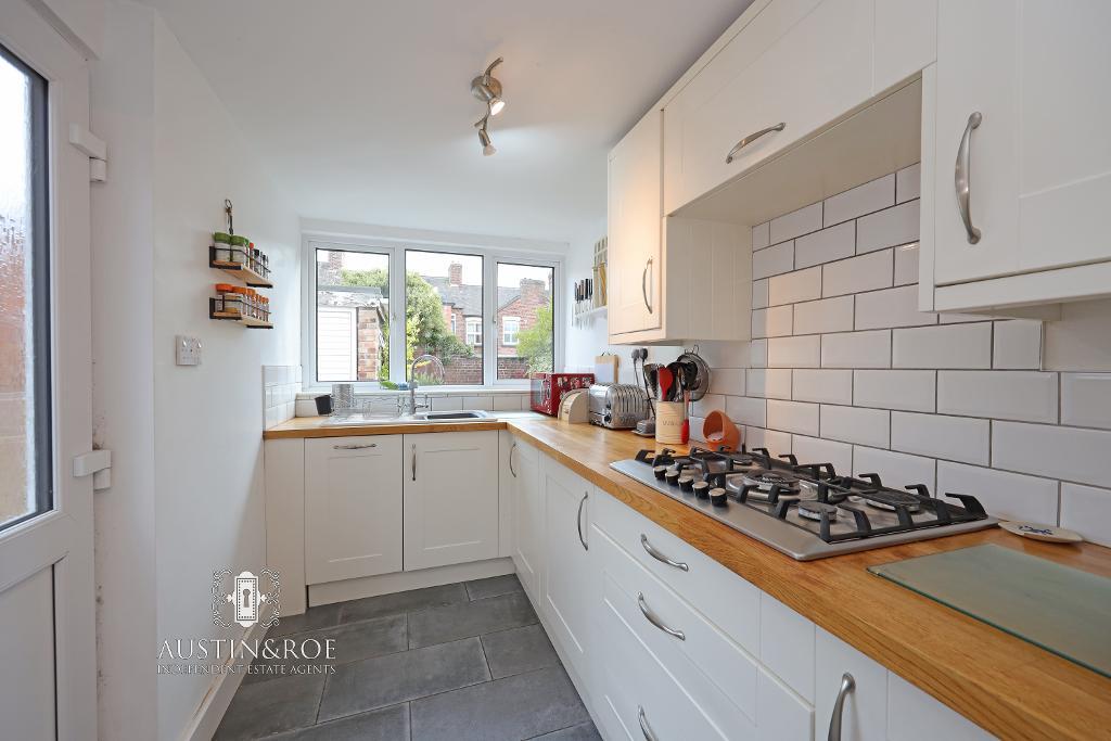 18' 8'' x 5' 9'' (5.71m x 1.77m) The Kitchen has white décor with white brick effect ceramic tiled splashback, a double glazed window to the rear aspect and a double glazed door and window to the side, a wall mounted central heating radiator, an understairs storage cupboard and a mid grey ceramic tiled floor. There are a range of cream shaker style wall and base units, with oak block countertop, inset with a white ceramic sink and chrome mixer tap, a stainless steel hob, an integrated electric oven and dishwasher.