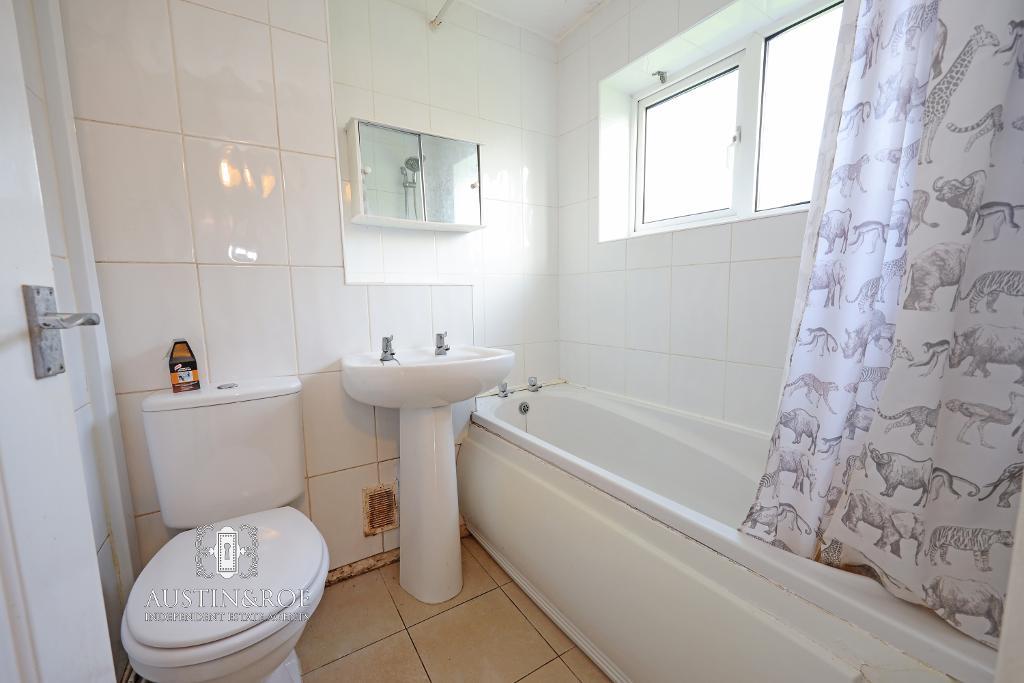 5' 6'' x 5' 10'' (1.7m x 1.79m) The Bathroom benefits from full height white ceramic wall tiling, a white ceiling with central light fitting, an obscured glass double glazed window to the side aspect, a wall mounted central heating radiator and ceramic tiled flooring. The white sanitaryware consists of a panel bath with chrome taps and shower above, a pedestal wash hand basin with chrome taps and a close coupled WC with push button flush.