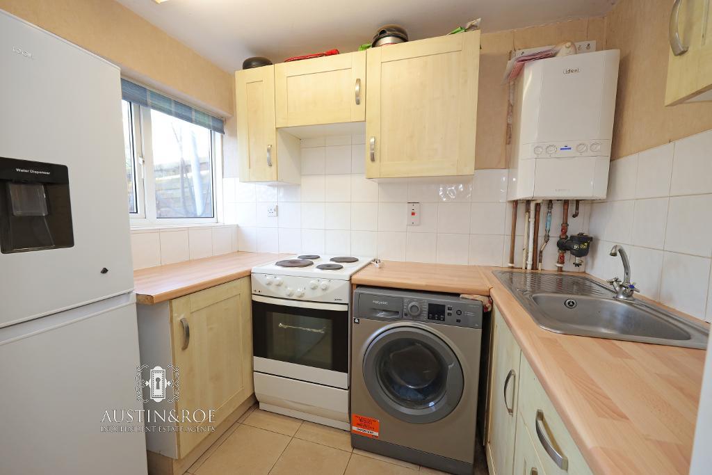 8' 1'' x 5' 10'' (2.48m x 1.79m) The Kitchen has neutral décor, a white ceramic tiled splashback, a white ceiling with central light fitting, a double glazed window to the rear aspect and ceramic tiled floor. There are a range of pale wood effect wall and base units, with a wood block effect countertop, inset with a stainless steel sink and chrome mixer tap, and spaces for a free standing oven, fridge freezer and washing machine.