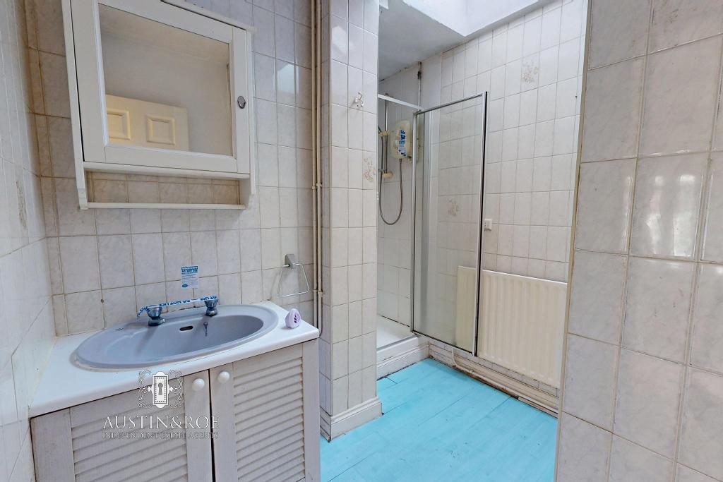 9' 4'' x 7' 2'' (2.85m x 2.19m) The Shower Room benefits from full height ceramic wall tiling, a white ceiling with roof window and spot light fitting, a wall mounted central heating radiator, and wood effect vinyl flooring. The grey sanitaryware consists of a vanity unit with inset wash hand basin and a close coupled WC with lever flush. There is an enclosed showering cubicle with glass door and electric shower.