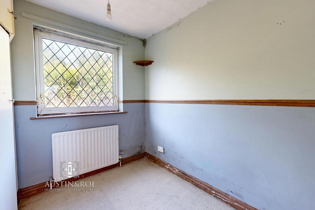 10' 1'' x 6' 9'' (3.09m x 2.06m) The Third Bedroom has blue décor with a mid height wooden dado rail, cream décor above, a white ceiling with central light fitting, a double glazed window to the rear aspect with a wall mounted central heating radiator below, a fitted wardrobe and neutral fitted carpet.
