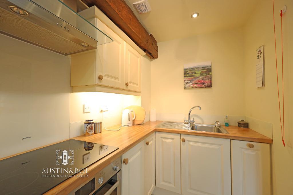 5' 5'' x 10' 6'' (1.66m x 3.21m) The Kitchen has neutral décor with clear glass splashback, a white ceiling with exposed wooden structural beam and spot light fitting and ceramic tiled effect vinyl flooring. There are a range of cream wall and base units, with a wooden block effect countertop, inset with a stainless steel sink and chrome swan neck mixer tap, a glass induction hob with stainless steel extractor hood above and integrated electric oven below and integrated fridge freezer.