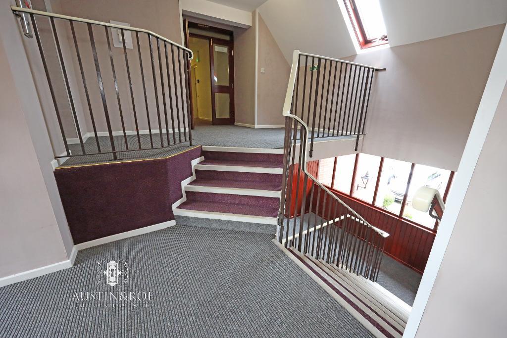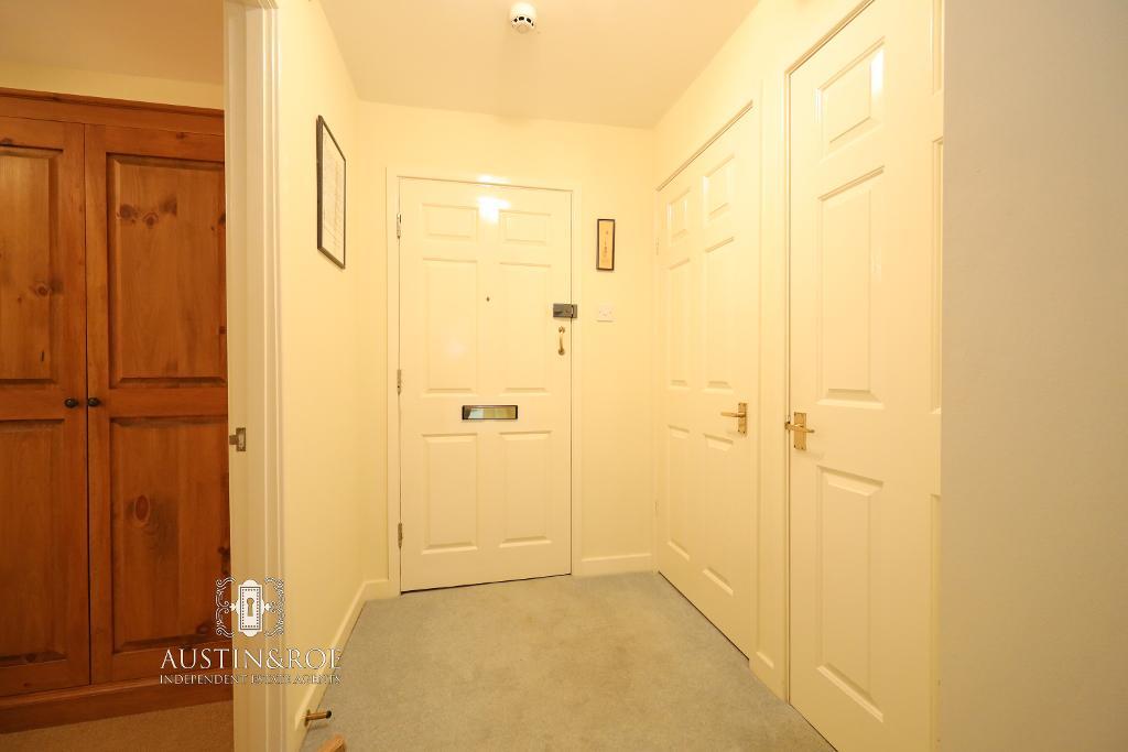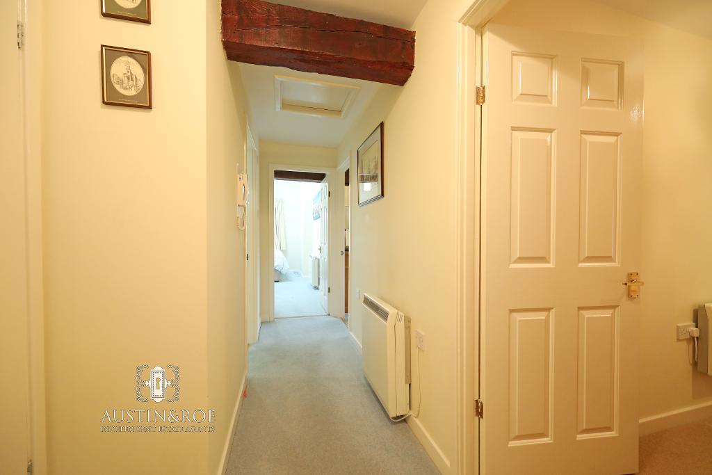 14' 9'' x 4' 8'' (4.51m x 1.43m) The Property is entered through a white solid door with spy hole viewer in to the Entrance Hallway, with neutral décor, a white ceiling with an exposed wooden beam and central light fitting, a warden alarm panel and pull cord, an electric wall mounted central heating radiator and grey fitted carpet.