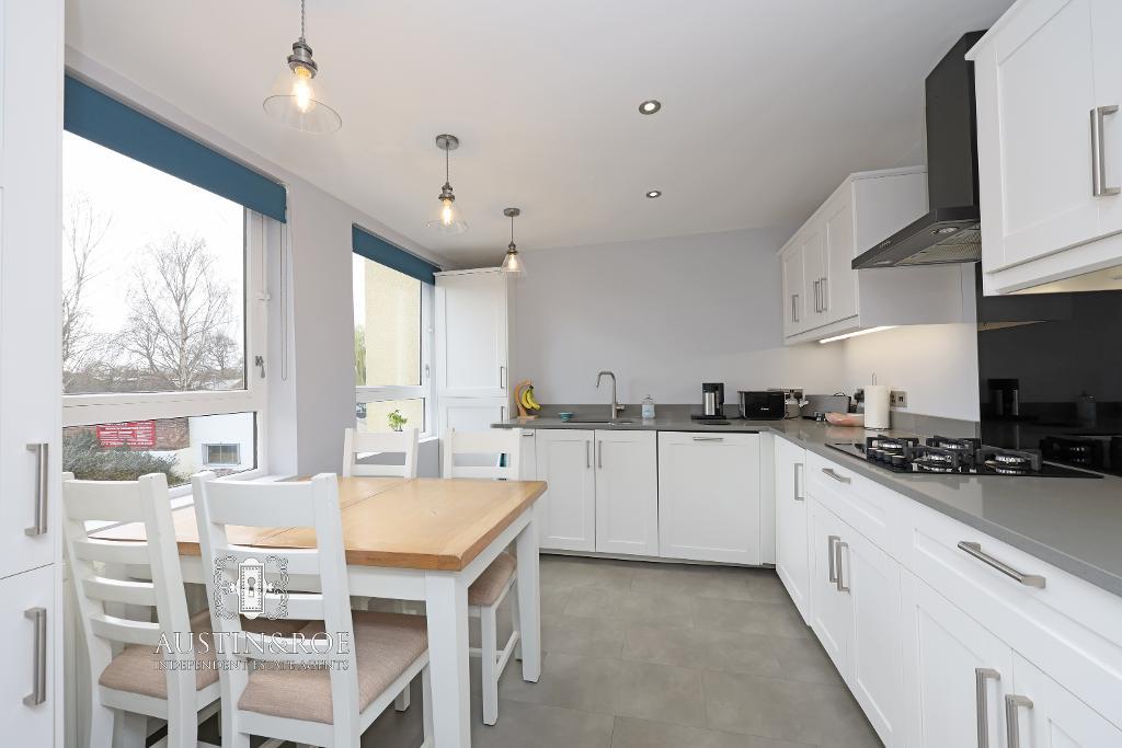 11' 6'' x 10' 1'' (3.52m x 3.09m) The modern Kitchen has pale grey décor, a white ceiling with three pendant lights and three recessed spot light, two large double glazed windows to the rear aspect, a wall mounted central heating radiator and grey stone effect vinyl flooring. There are a range of white wall and base units, with a pale grey quartz countertop and upstand, inset with an under counter bowl and a half sink and stainless steel swan neck mixer tap, a gas hob with glass splashback and extractor hood above, an integrated electric double oven/microwave/grill, integrated fridge freezer and dishwasher.
