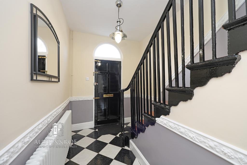 23' 10'' x 6' 9'' (7.28m x 2.09m) The Property is entered through a black timber door with arched transom window above in to the impressive Entrance Hallway, with pale grey and white décor, a black and white chequerboard ceramic tiled floor, a white ceiling with pendant light fitting, a traditional style column radiator and the winding staircase to the floor above. There are original pine doors leading in to the Dining / Sitting Room, Kitchen, Basement and Utility, and an external door leads to the rear of the Property.