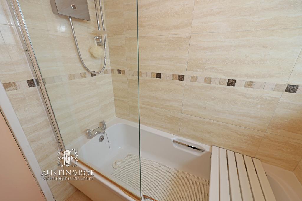 5' 0'' x 5' 5'' (1.54m x 1.66m) The Bathroom benefits from full height stone effect ceramic wall tiling with feature border, a wood panelled ceiling with central light fitting, an obscured glass double glazed window to the rear aspect, a wall mounted central heating radiator and stone effect ceramic tiled floor. The sanitaryware consists of a white panel bath with chrome electric shower and glass screen and a white vanity unit with inset wash hand basin and chrome mixer tap.